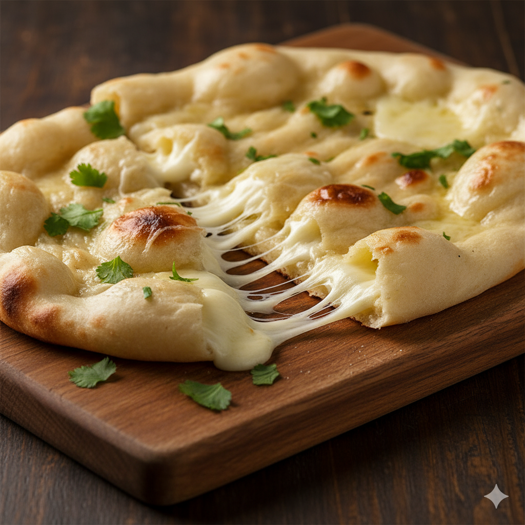 Naan de Queso – Pan tradicional desi relleno con queso derretido, suave y cremoso. Perfecto para acompañar platos picantes o disfrutar solo.