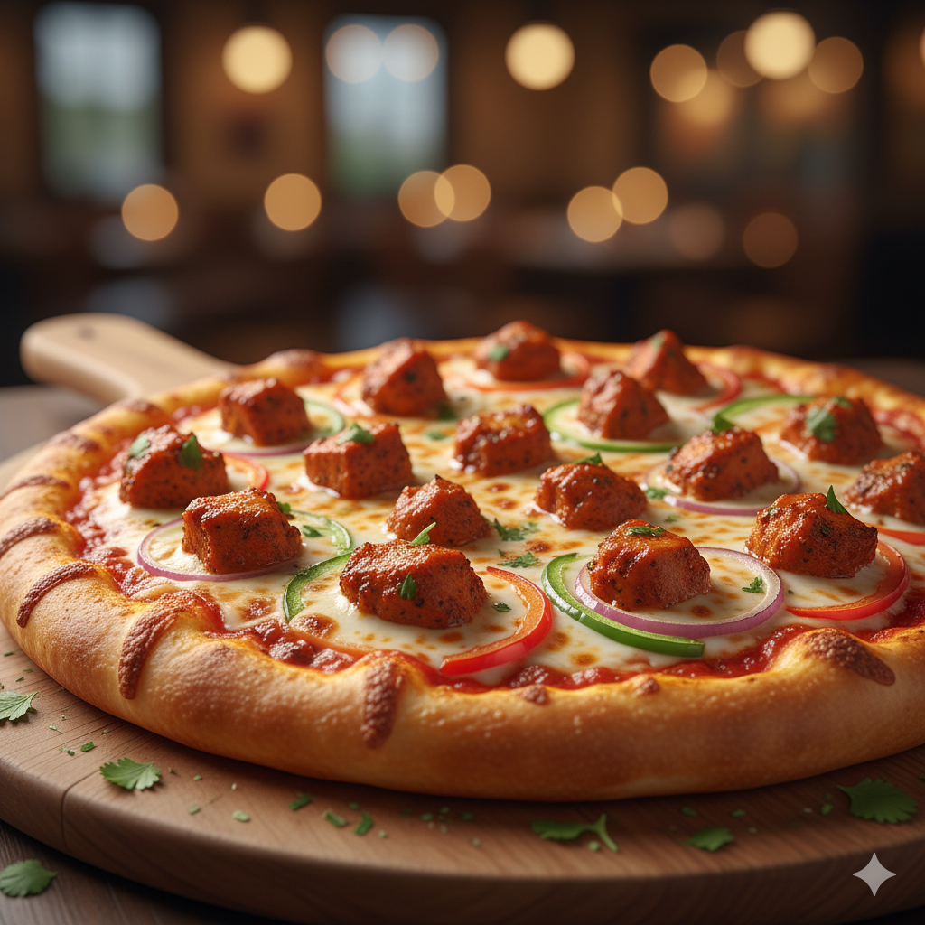 Nuestra Pizza Punjabi tiene una base fina y crujiente con salsa de tomate casera y mozzarella derretida. Se cubre con pollo tierno especiado al estilo Punjabi, acompañado de pimientos y cebolla fresca, creando un sabor intenso, aromático y delicioso en cada bocado. Ideal para quienes disfrutan de sabores auténticos y exóticos.