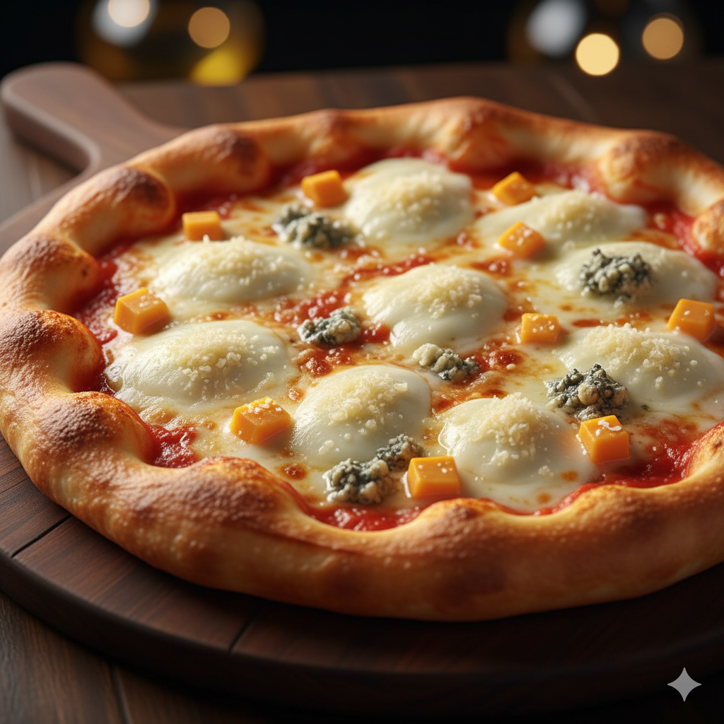 Nuestra Pizza de Quesos combina una base fina y crujiente con salsa de tomate casera y una mezcla de quesos fundidos que se derriten perfectamente, creando un sabor cremoso y delicioso en cada bocado. Ideal para los amantes del queso y quienes buscan una pizza suave y sabrosa.